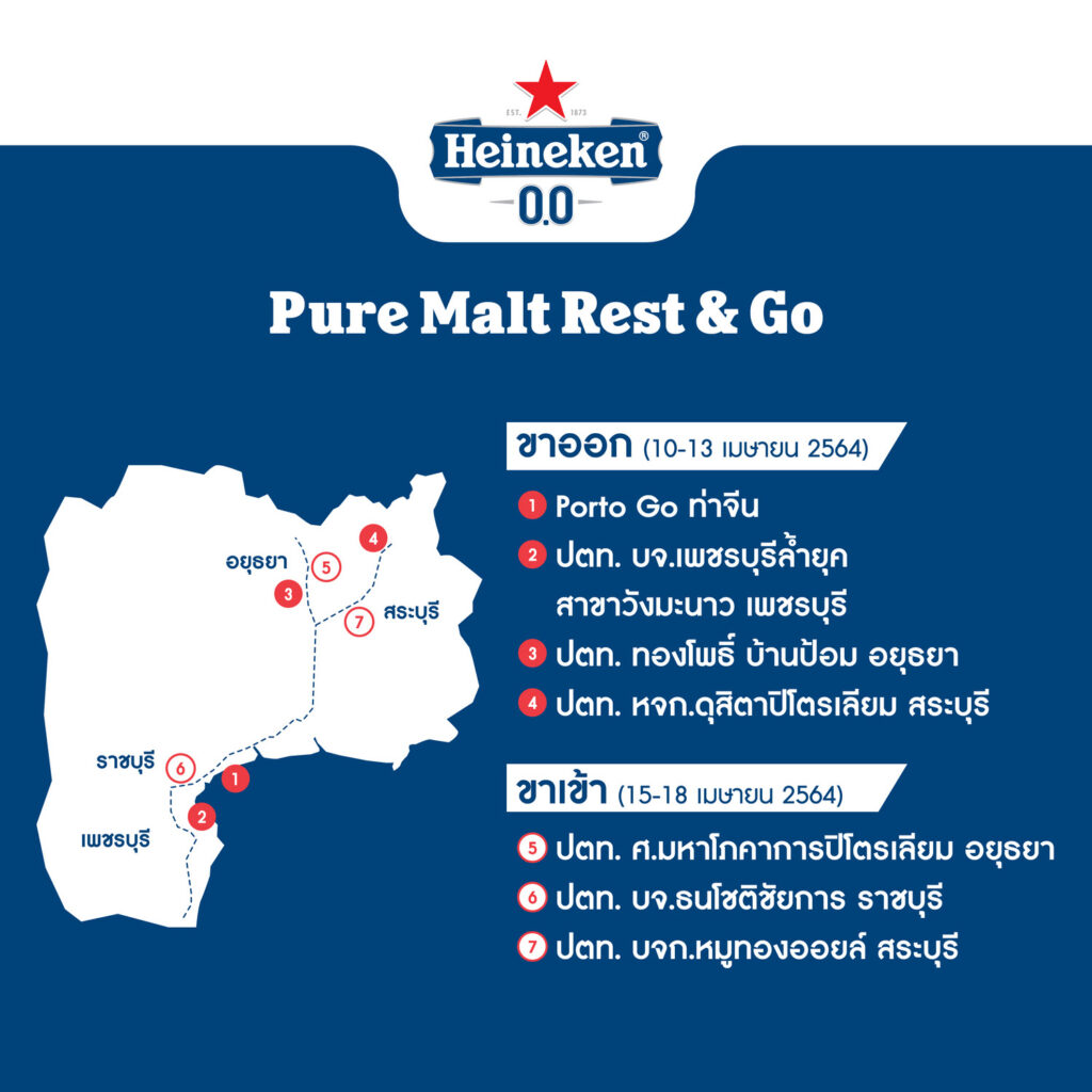 จุดพักรถจากไฮเนเก้น 0.0 มีทั้งหมด 7 แห่ง ซึ่งกระจายอยู่ตามหัวมุมเมืองต่าง ๆ ใน 5 จังหวัด ครอบคลุมเส้นทางถนนสายหลักจากกรุงเทพฯ มุ่งหน้าสู่ภาคเหนือ ภาคอีสาน และภาคใต้ ได้แก่ อยุธยา สมุทรสาคร เพชรบุรี ราชบุรี และสระบุรี โดยขาออกจากกรุงเทพฯ จะจัดกิจกรรมขึ้นระหว่างวันที่ 10 -13 เมษายน และขาเข้ากรุงเทพฯ จะจัดกิจกรรมขึ้นระหว่างวันที่ 15-18 เมษายน 2564 ให้ผู้เดินทางได้สดชื่นกันตลอดการเดินทางทั้งไปและกลับ