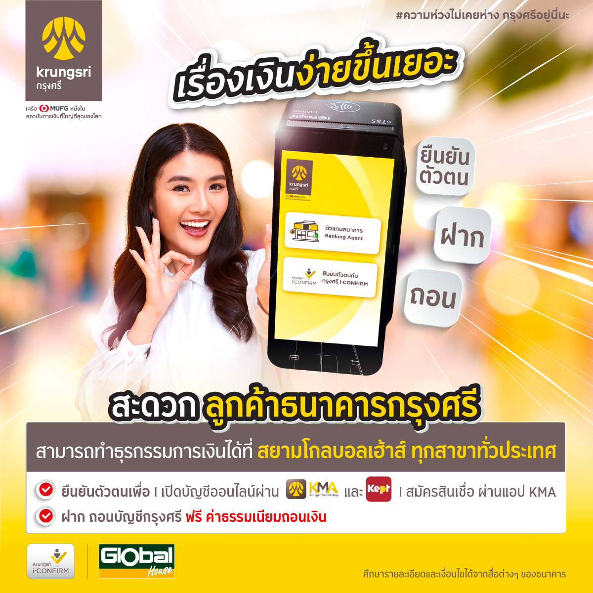 กรุงศรีได้ด้วย ที่โกลบอลเฮ้าส์ (Global House) ทุกสาขาทั่วประเทศ พิเศษ ฟรี! ค่าธรรมเนียมการถอนเงิน สำหรับลูกค้าที่ทำธุรกรรมที่โกลบอลเฮ้าส์