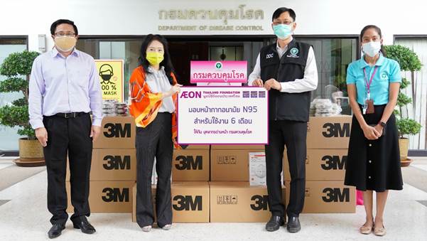กรุงเทพฯ, ประเทศไทย – วันที่ 26 ตุลาคม 2564– คุณสุพร วัธนเวคิน (ที่สองจากซ้าย) ประธานกรรมการมูลนิธิอิออนประเทศไทย และคุณวิชชศร สุวรรณนาคินทร์ (ซ้ายสุด) รองกรรมการผู้จัดการอาวุโส บริษัท อิออน ธนสินทรัพย์ (ไทยแลนด์) จำกัด (มหาชน) ส่งมอบหน้ากากอนามัย N95 สำหรับใช้งาน 6 เดือน ให้กรมควบคุมโรค กระทรวงสาธารณสุข เพื่อนำไปมอบให้บุคลากรทางการแพทย์และสาธารณสุขด่านหน้า โดยมี นายแพทย์อาจินต์ ชลพันธุ์ (ที่สองจากขวา) รักษาการนายแพทย์ทรงคุณวุฒิ เป็นผู้แทนอธิบดีกรมควบคุมโรครับมอบ ณ กรมควบคุมโรค กระทรวงสาธารณสุข นอกจากนี้ ทางมูลนิธิฯ ยังได้สนับสนุนอาหารกลางวันให้กับเจ้าหน้าที่ผู้ปฏิบัติงาน ณ จุดฉีดวัคซีนป้องกันโรค Covid-19 ณ สถาบันบำราศนราดูรอีกด้วย ซึ่งการบริจาคครั้งนี้ถือเป็นการแสดงให้เห็นถึงความตั้งมั่นของมูลนิธิอิออนประเทศไทยที่มีความตั้งใจที่จะให้การช่วยเหลือและสนับสนุนการปฏิบัติหน้าที่ของบุคลากรทางการแพทย์และสาธารณสุขด่านหน้าอย่างต่อเนื่อง อันเป็นอีกหนึ่งกำลังใจเพื่อให้ประเทศไทยก้าวผ่านสถานการณ์โควิด-19 นี้